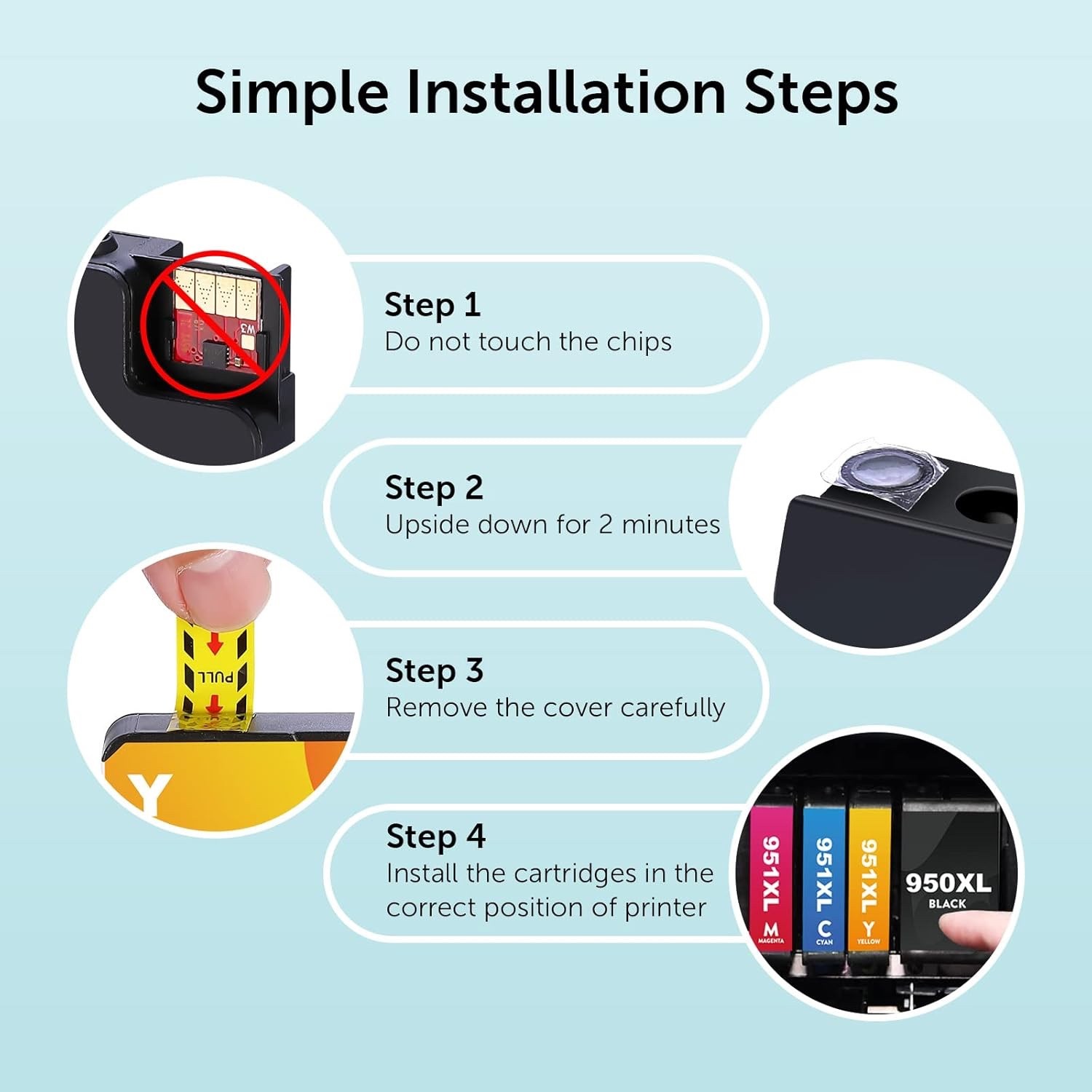 This 4PK 950XL 951XL Compatible Ink Cartridge Set includes 1 Black (950XL) and 3 Colors (951XL: Cyan, Magenta, Yellow) , designed to deliver crisp text and vibrant color output for everyday printing needs.