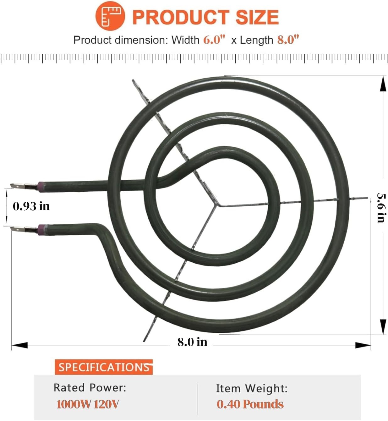 Replacement electric stove burner element designed for reliable heating and consistent performance. This 6-inch burner element features a 3-turn coil design and is rated at 1000 watts, 120 volts , making it suitable for standard electric ranges.