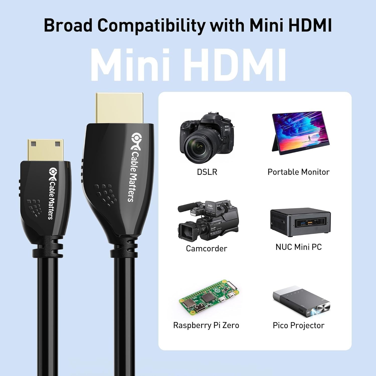 High-quality Mini HDMI to HDMI cable adapter designed to connect devices with Mini HDMI (Type C) ports to standard HDMI (Type A) displays. Perfect for connecting cameras, tablets, camcorders, and other devices to TVs, monitors, or projectors.