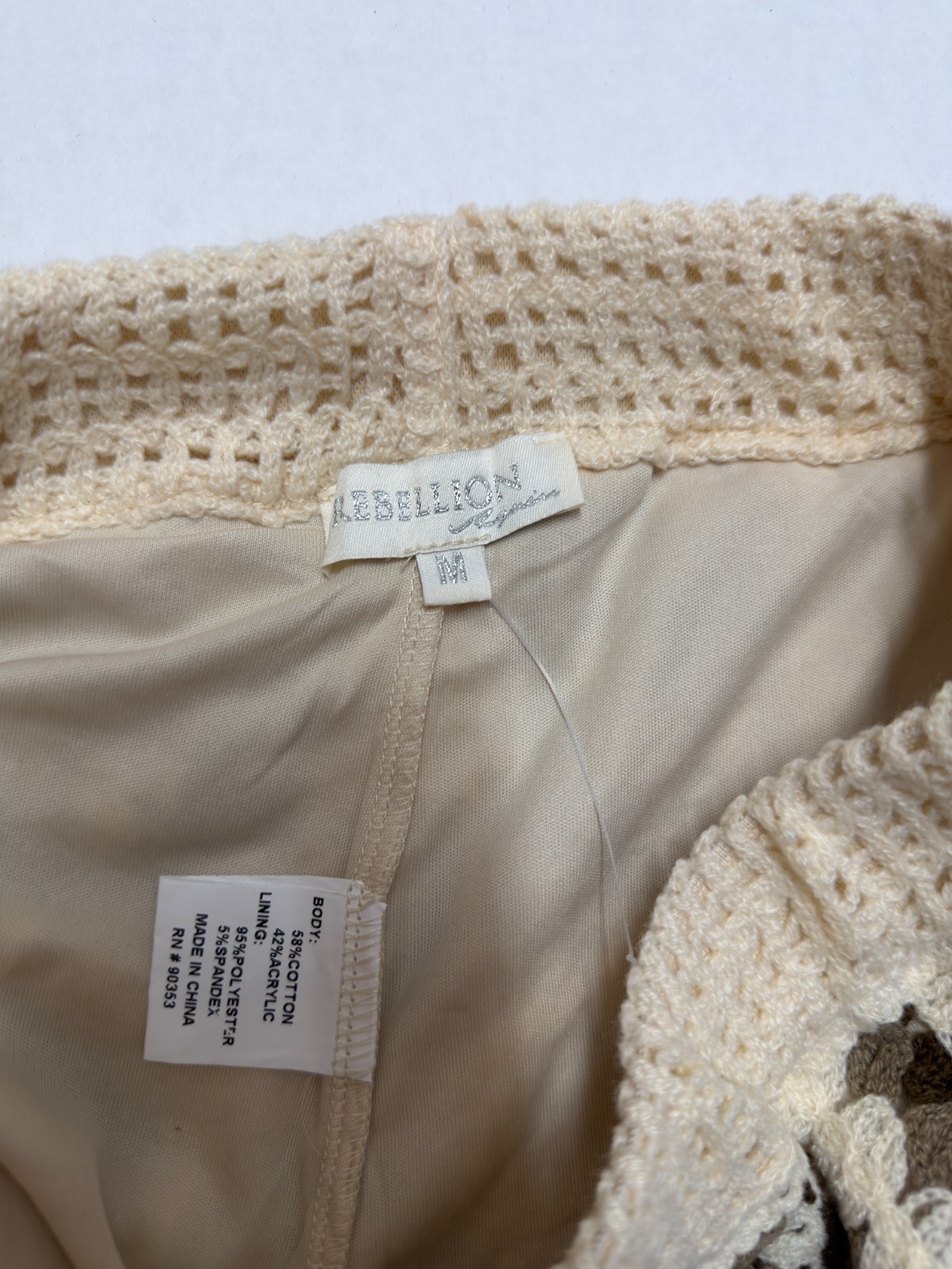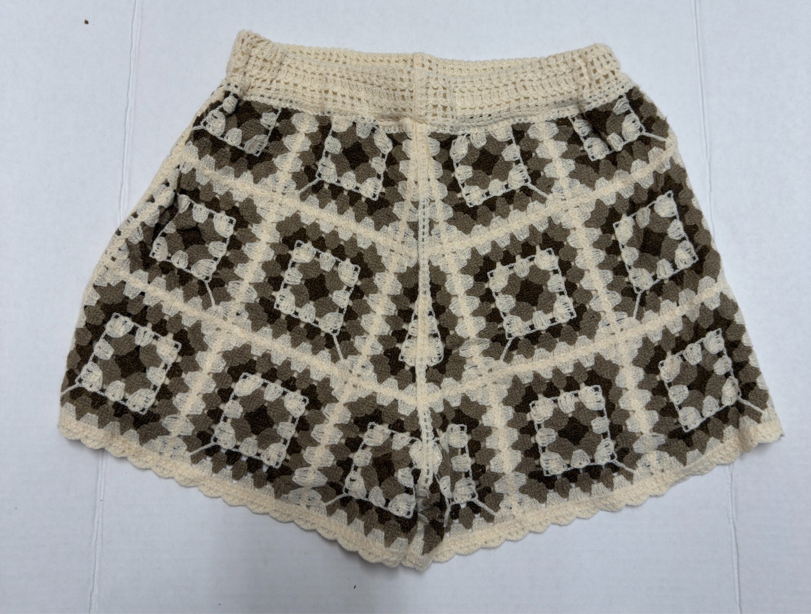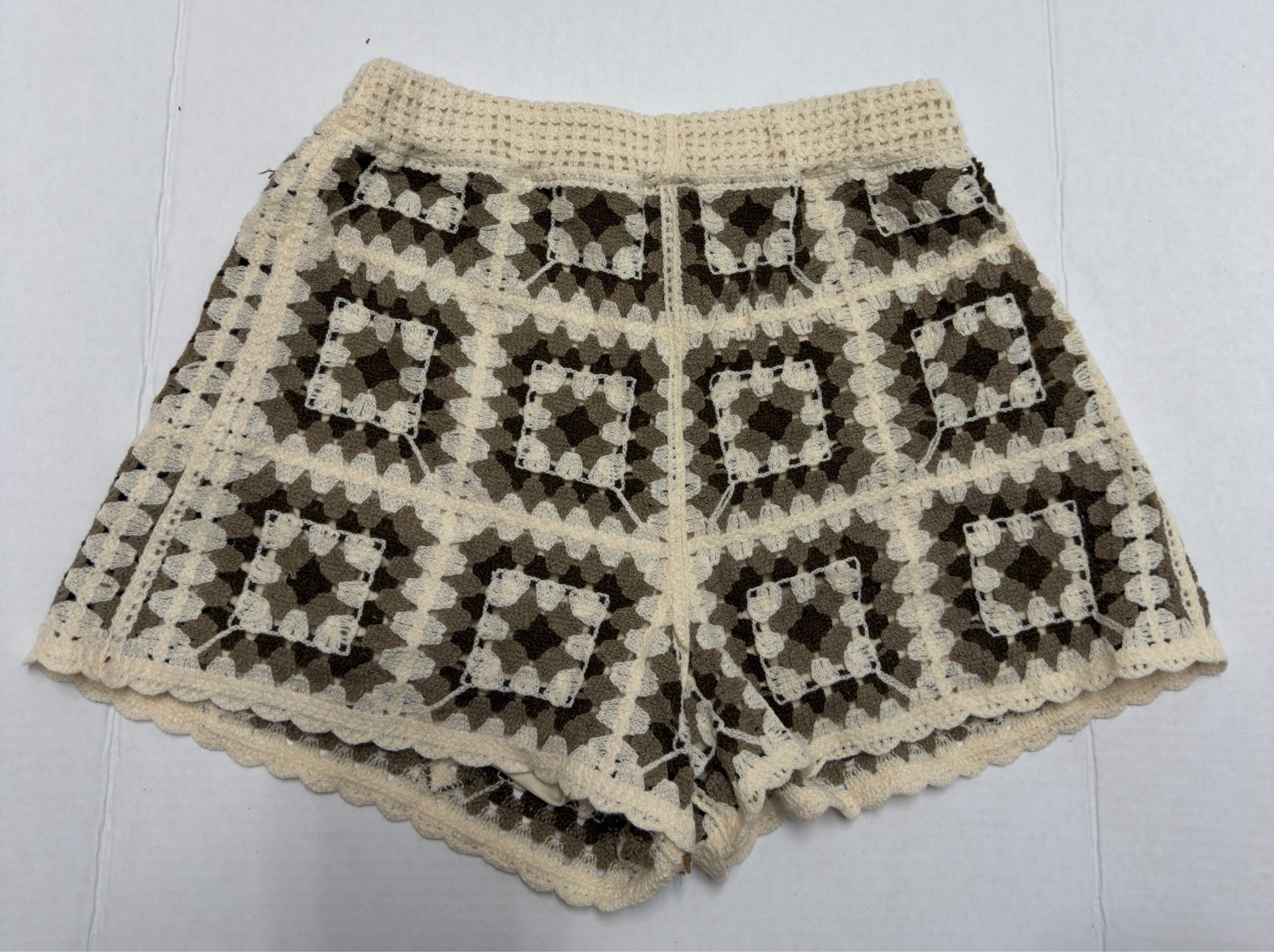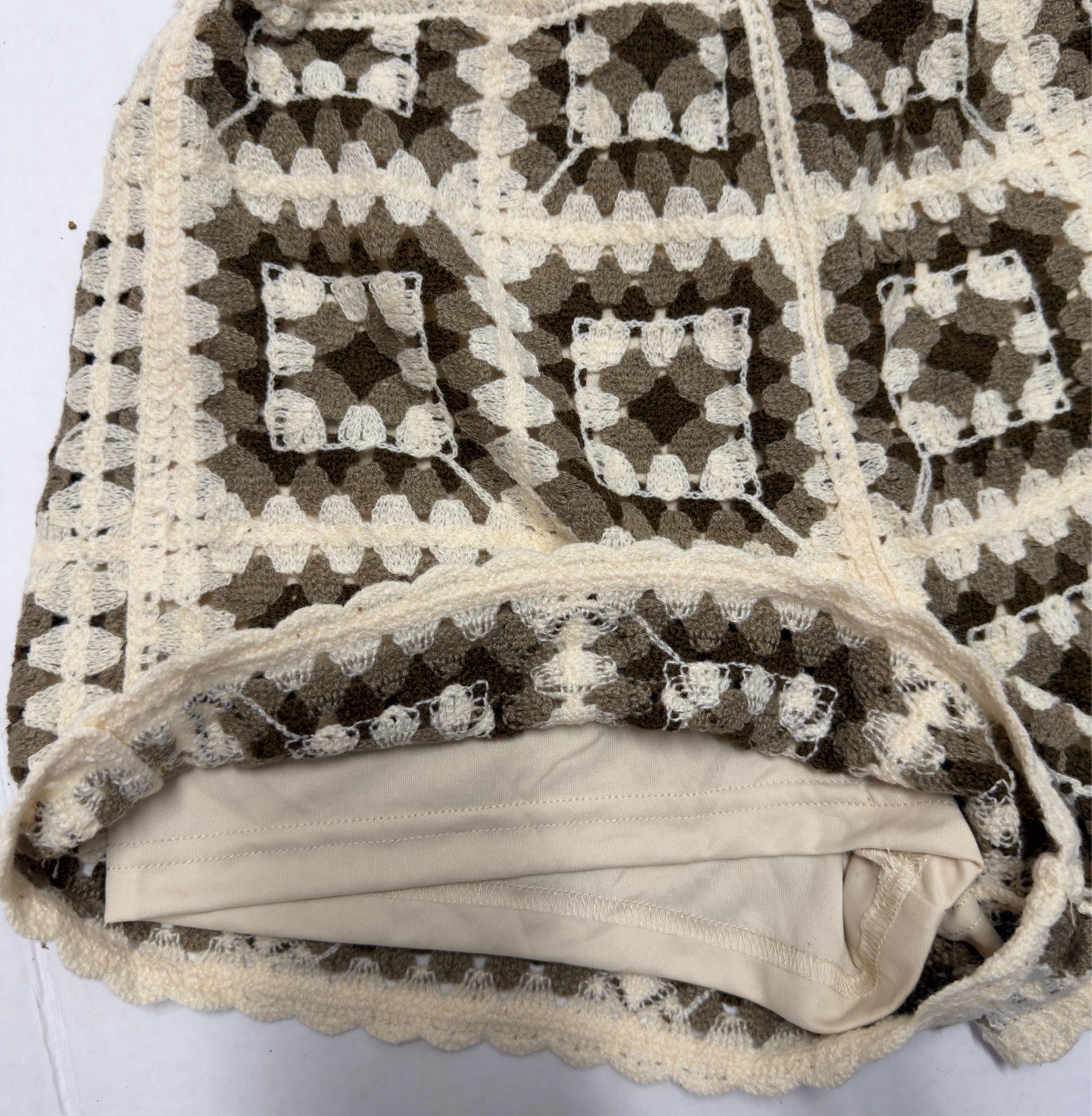 Rebellion Women’s Crochet Shorts – Size M – Brown & White – Mid Rise – Boho Festival Beach